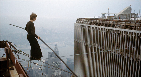It is a little difficult to take everything that Petit says entirely seriously; his constant describing of things as ‘beautiful’ and his playing down of the dangers involved in his escapades suggest a highly romanticized, and dare I say French, view on life and his craft. So we have to go on trust with his claim that it was as a young boy sitting in a dentist’s waiting room reading a newspaper article about the proposed construction of the world’s tallest building that he first developed the idea of doing this high-wire stunt to end all stunts. In one of several staged reconstructions we see the young Petit scribble a line between the two towers’ peaks, at once a simple piece of defacing and a signal of serious intent.