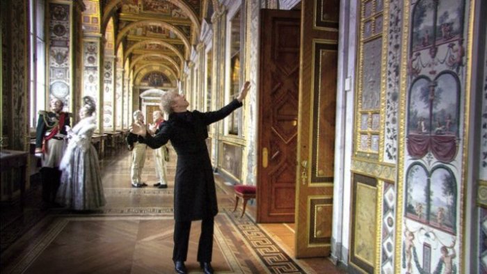 The presence of two, rather than one, near-omnipresent travellers across the halls of the Hermitage museum and the history of Western civilization creates a formal tension between the idea of mimetic and diegetic narration. The guide, later identified as Marquis de Custine, appears able to interact with the rest of the cast of characters, and seems to be steering the direction of the narrative, ‘telling’ the story of the film. By contrast, the unseen character aligned with the camera seems to be invisible, at once an ideal spectator and a passive observer being ‘shown’ what is happening. Which of these is the audience to identify with, if either? The latter would be the conventional answer, given that the former is the ‘ghost’ of an identifiable historical character, yet within the diegetic world of the film, the real ‘ghost’ would appear to be the apparently unseeable one aligned with the camera.